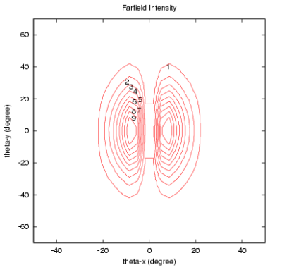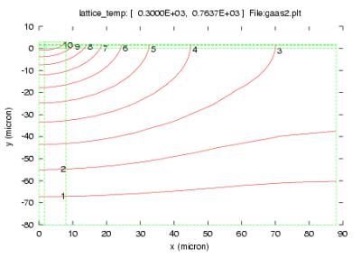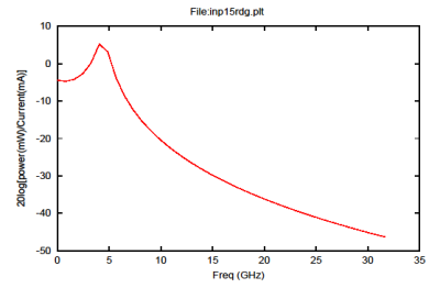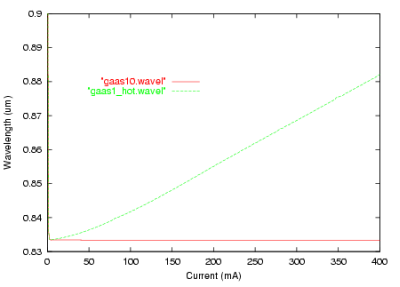 自己発熱有り(緑線)と無し(赤線)の場合の発振波長の比較。