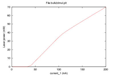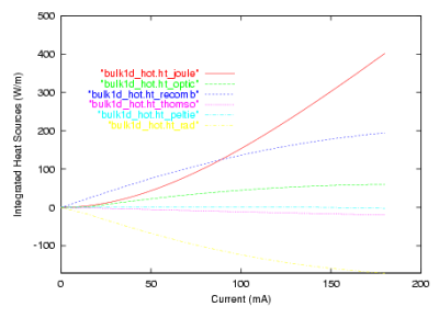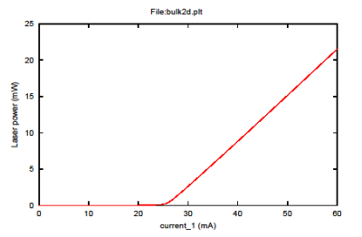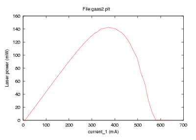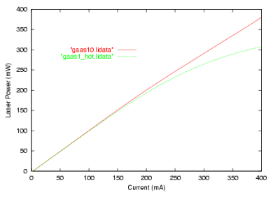 自己発熱有り(緑線)と無し(赤線)の場合のI-L特性の比較。